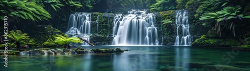 Obraz premium A tranquil waterfall cascading into a clear pool surrounded by lush tropical...