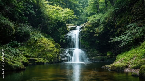 © SETSU 21, Naklejka premium A tranquil waterfall in the Black Forest, Germany, with lush green surroundings and space for text