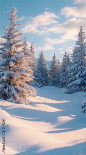 © ZpongXED, Obraz premium A tranquil winter landscape featuring snow-covered trees and soft, undulating drifts under a bright sky.