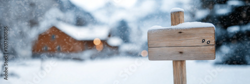Naklejka premium A tranquil winter scene captures a wooden sign covered in snow, set against a soft-focus backdrop of a cabin and snowy landscape, symbolizing peace and solitude.