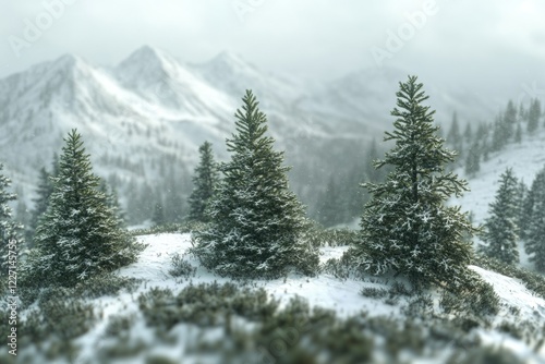 Fototapeta premium A tranquil winter scene featuring a cluster of pine trees blanketed in snow...