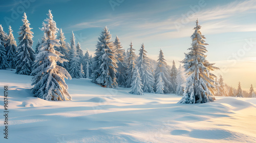Obraz premium A tranquil winter scene with snow-covered evergreen trees under a light...