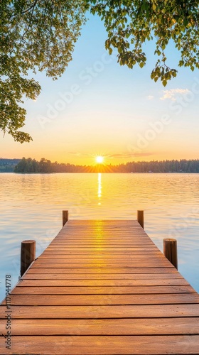 Fototapeta premium A tranquil wooden dock extends over a calm lake, illuminated by a warm sunset, framed by lush trees, creating a serene natural landscape.