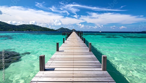 Obraz premium A tranquil wooden pier extends into a vibrant turquoise sea, framed by lush...