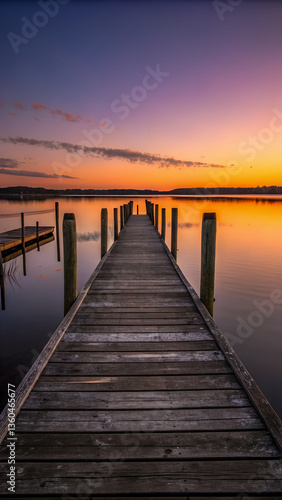 Naklejka premium A tranquil wooden pier stretching into a serene lake at sunset with soft...