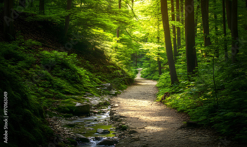 Obraz premium A tranquil woodland path meanders through a lush green forest, sunlight...