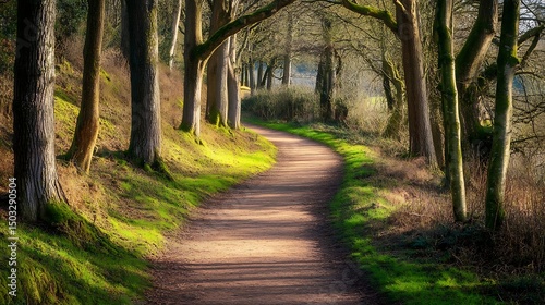 Fototapeta premium A tranquil woodland path with dappled sunlight filtering through the trees