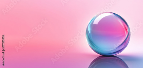 © Oleksandr Panasovsky, Obraz premium A translucent glass or crystal sphere with iridescent blue and pink reflections sits on a reflective surface against a soft pink gradient background. Generative AI.
