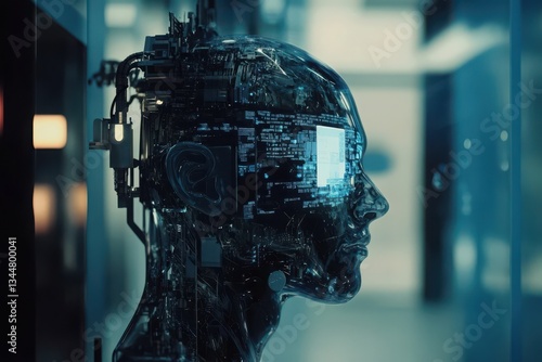 Fototapeta premium A translucent robotic head, its internal circuitry glowing with data, evokes...