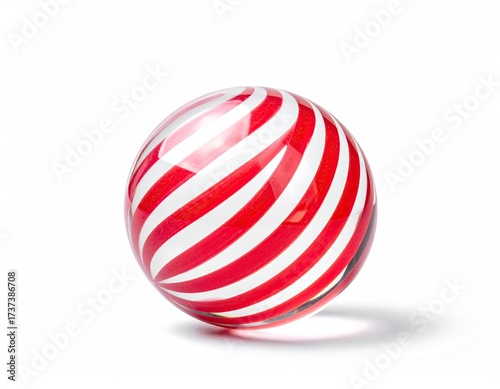 © pires, Fototapeta premium A transparent sphere features red and white stripes, with a shadow, on a white background