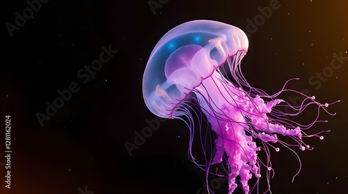 Naklejka premium A transparent white jellyfish glowing purple under the deep, dark,...