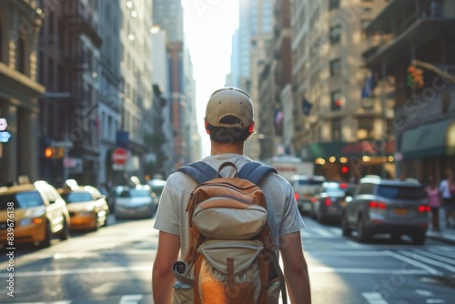 Fototapeta premium A traveler in a grey hat and yellow backpack ready to cross an urban street.