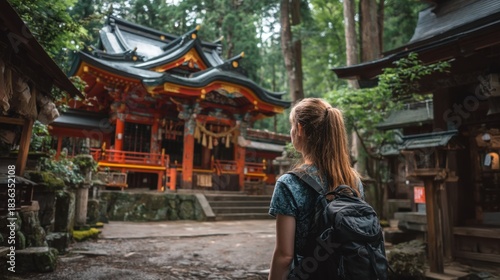 © mila103, Obraz premium A traveler stands quietly gazing at a historic shrine nestled among tall trees. The site is peaceful and invites reflection showcasing traditional architecture.