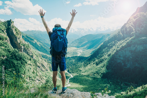 © wifesun, Obraz premium a traveler with a backpack on the edge of the cliff raised his hands in the air mountains in the background