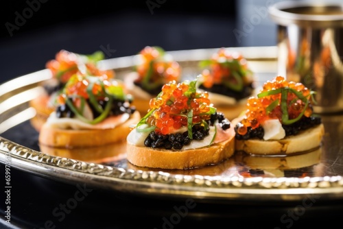 © altitudevisual, Fototapeta premium a tray holding multiple pieces of bruschetta topped with caviar