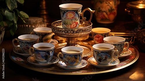 © Olga, Obraz premium a tray that has some cups and saucers on it. generative ai