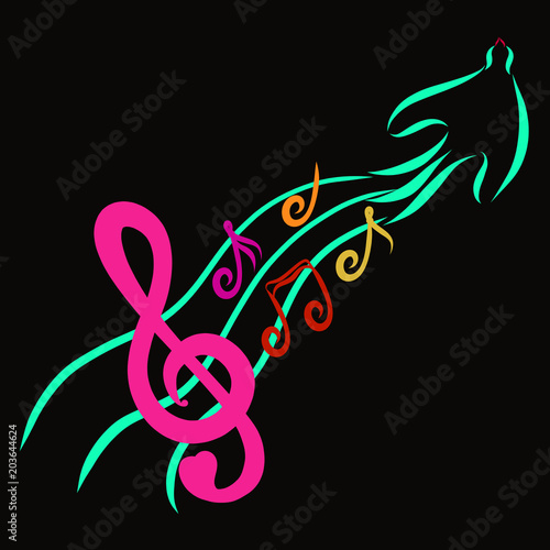 Naklejka premium A treble clef with a heart and notes on the tail of a bird