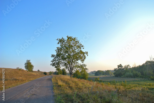 © Ruslan, Obraz premium A tree against a background of blue sky at dawn, a minimalistic landscape.