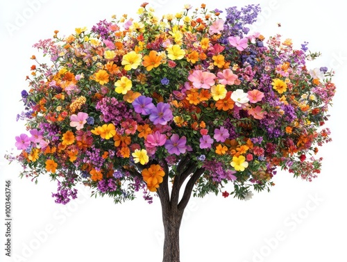 Fototapeta premium A tree covered in colorful flowers, isolated on a plain white background,...