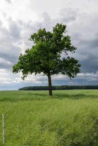 Fototapeta premium a tree growing in a rapeseed field in cloudy weather