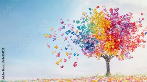 Fototapeta premium A tree grows from scattered puzzle pieces, with each branch made of different vibrant colors