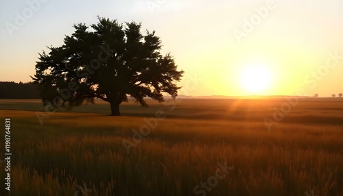 © KWY, Fototapeta premium a tree in a field with the sun setting in the background