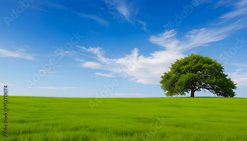 Fototapeta premium A tree in grass field with blue sky and beautiful nature landscape....