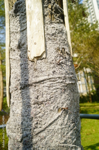 © feng67, Fototapeta premium A tree is braided with cloth to protect its trunk from the cold