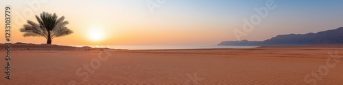 © Andrii Zastrozhnov, Fototapeta premium A tree is in the foreground of a desert landscape. The sun is setting in the background, casting a warm glow over the scene. The sky is a mix of orange and blue hues, creating a serene