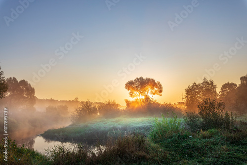 © Sergei, Naklejka premium A tree is silhouetted against the sky as the sun sets