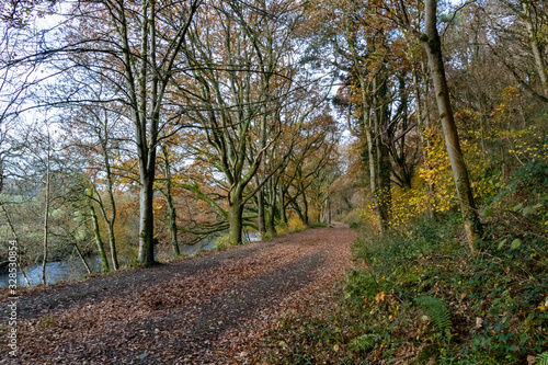 Fototapeta premium A Tree Lined, Autumn View Along a Leaf Covered Rolle Road, Site of the Victorian Rolle Canal; Great Torrington, Devon, England.