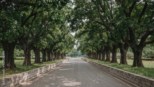 Obraz premium A tree-lined road with lush green trees on both sides forming a canopy over...