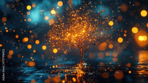 Obraz premium A 'tree' made of suspended, glowing liquid metal droplets, frozen mid-air,...