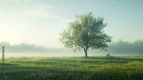 © Thanaseth, Obraz premium A tree standing in a green meadow with plants and clear air, affected by surrounding air pollution and climate change, AIgenerated environmental art