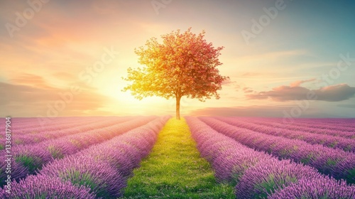 © Nattawut, Obraz premium A tree stands in a field of lavender flowers
