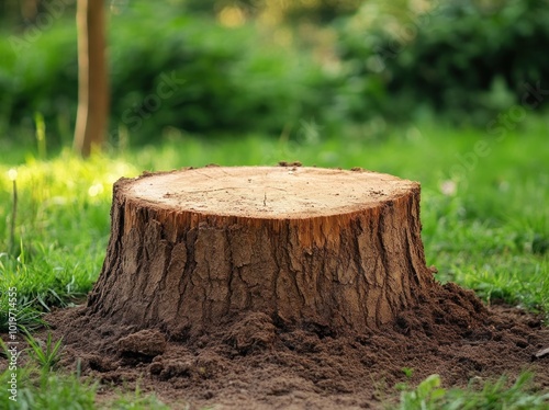 © BerkahStock, Fototapeta premium A tree stump surrounded by grass in a natural setting.