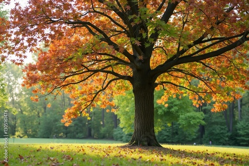© Zeynep, Naklejka premium A Tree With Leaves on the Ground in a Grassy Field - Generative AI
