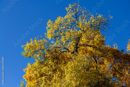 Fototapeta premium A tree with yellow, golden leaves. A bright blue sky in the background.