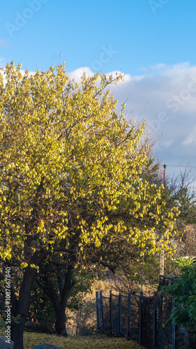 © mikus, Naklejka premium A tree with yellow leaves and a path under it lead down