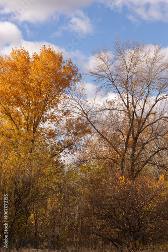 © zenith zones, Fototapeta premium a tree with yellow leaves is in a field with a sky background.