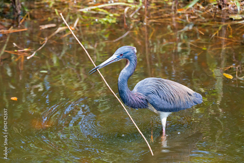 Fototapeta premium A Tri-Colored Heron holds a stick in its beak for nest building during mating season.