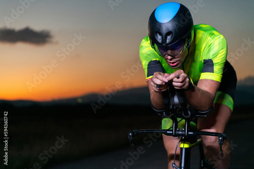 Naklejka premium A triathlete rides his bike in the darkness of night, pushing himself to...