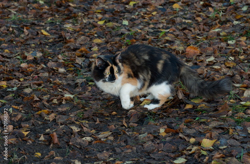 © Andrey, Fototapeta premium A tricolor cat walks on dry fallen leaves on an autumn day.