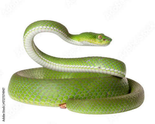 Obraz premium A Trimeresurus albolabris viper rearing up in a defensive striking pose, body...