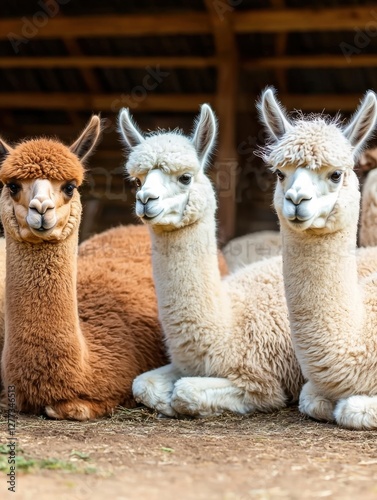 © iNCuteCraffic, Fototapeta premium A trio of alpacas, one brown and two white, sit together in a barn setting, showcasing their soft fur and friendly expressions.