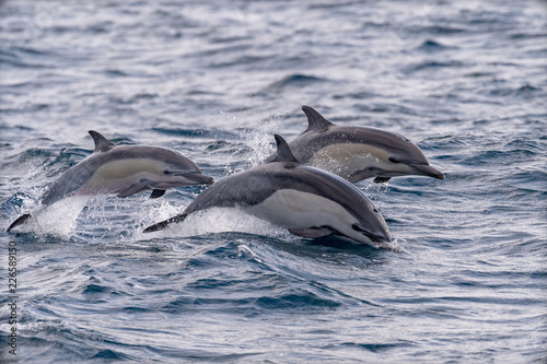 Fototapeta premium A trio of common dolphins jump out of water