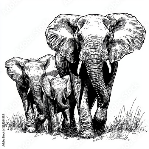 Naklejka premium A trio of elephants walks together through tall grass, showcasing their majestic presence in a stylized black and white illustration.
