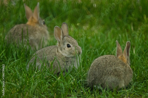 Fototapeta premium A trio of rabbits in a grassy yard.