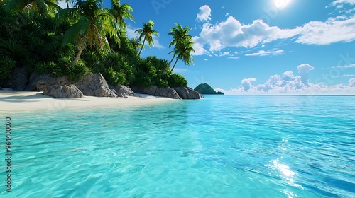 Fototapeta premium A tropical beach glows with turquoise waters and swaying palms, a perfect...