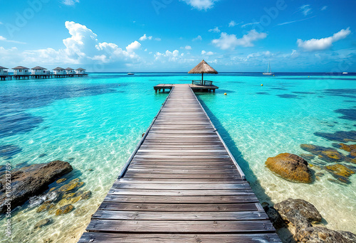 Obraz premium A tropical beach with crystal clear turquoise water, a wooden dock or pier...